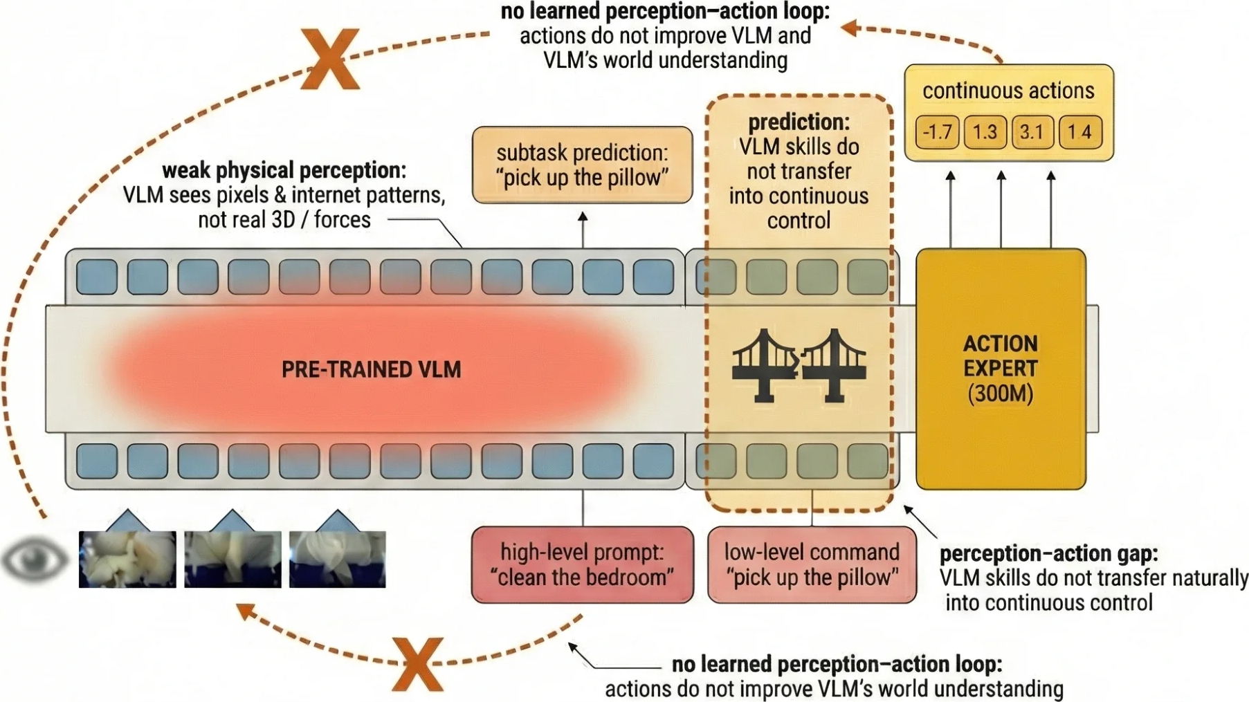 动作只改进末端 expert,VLM 不因交互更新世界理解,无闭环反馈修正感知与决策